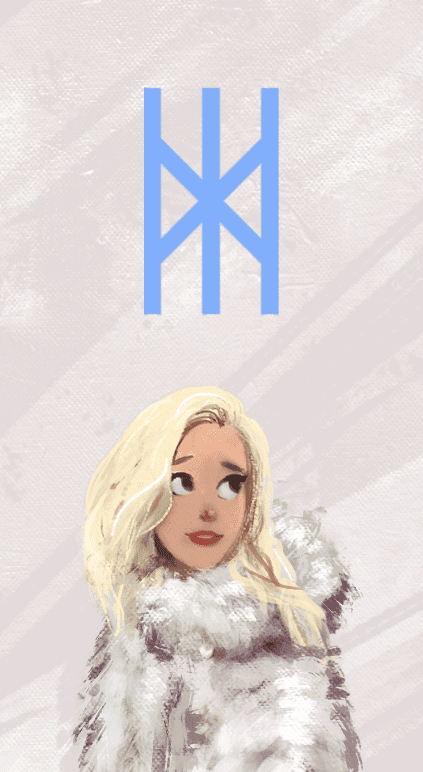 The rune on her hat combines the runes for ice, wrath of nature and resistance. She deliberately looks like Elsa to utilise the huge psychic energies of millions of young girls idolising the paragon of an