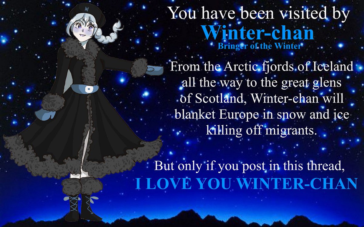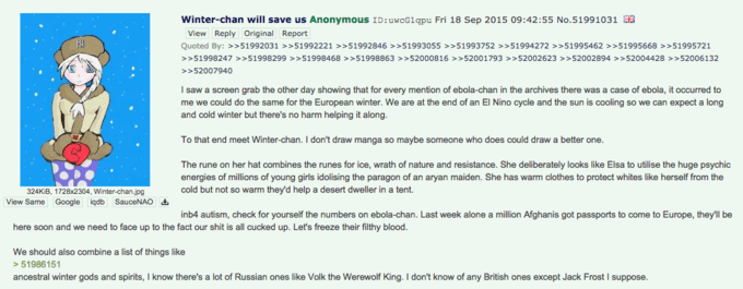 On September 18th, a user on the 4chan political board /pol/ created a post entitled "Winter-chan will save us."[1]